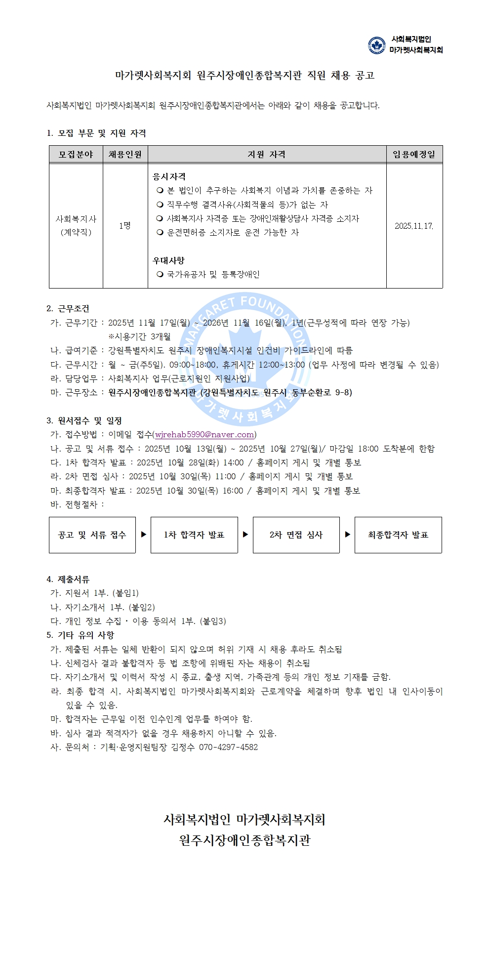 사회복지법인 마가렛사회복지회 원주시장애인종합복지관에서는 아래와 같이 채용을 공고합니다.